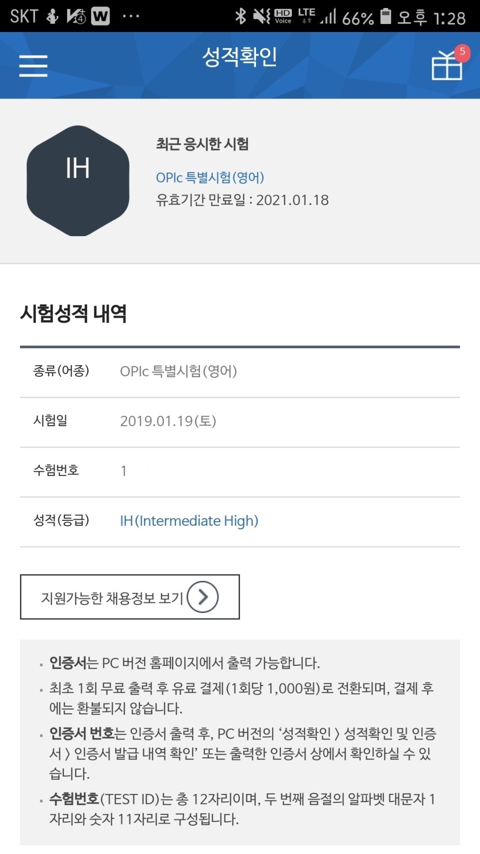 '18년 10월 28일 첫 수업 이후 2주 텀으로 수업을 진행했으며, 마지막 6회차 수업 직전인 '19.1월 19일에 시험을 한번 봤고 목표했던 IH가 단번에 나와주어 너무 만족스럽습니다.