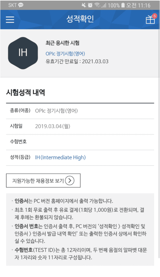 다 푸니까 26분만에 시험을 봐서 제가 고사장에서 제일 먼저 나왔습니다. 나오면서 몇개 문법이 틀린게 생각나면서 아 웨이버 바로 써야겠다라고 생각하며 재접수를 하고 나서 성적을 확인하였는데 IH가 나온걸보고 믿을 수 가 없었습니다.