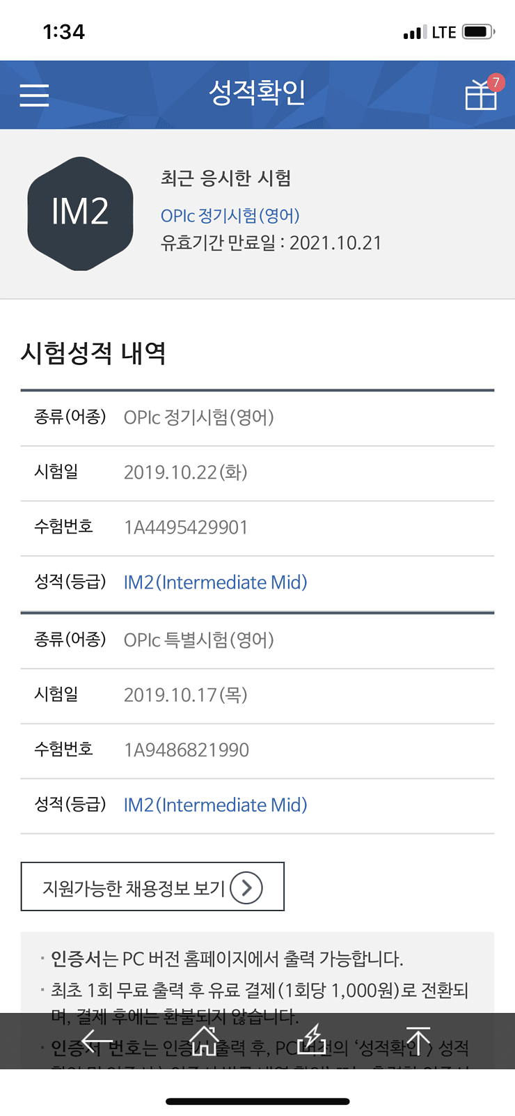 만족하지만 앞으로 더 공부해서 IH 이상을 획득하도록