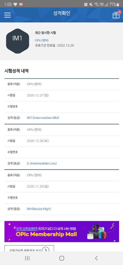 IM1 이네요ㅠㅠ 진급 포기해야되나 하고 있었는데 오히려 목표했던 점수보다