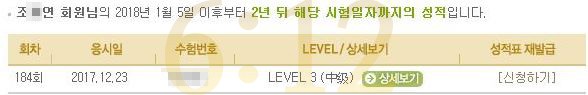 짧은 시간(보름) 동안 7회 수업을 마치고 첫 시험에서 3급을 획득하였습니다.