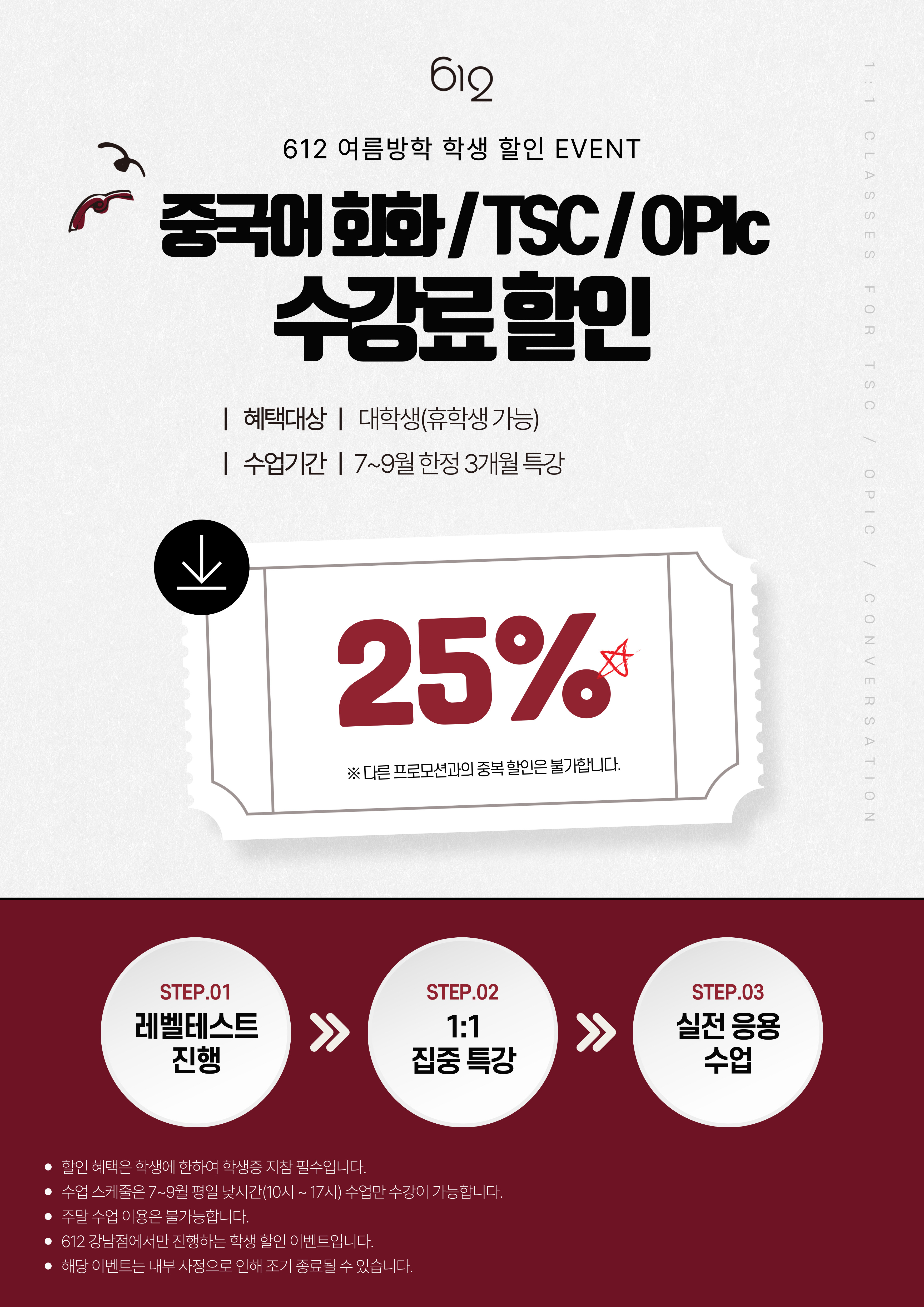 - 612어학원 수강 희망자 중 대학생 및 휴학생(※ 학생증 지참 필수)