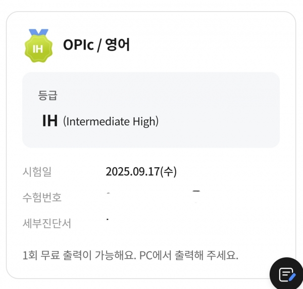 초기 등급은 IM2,목표 등급은 IH 그리고획득 등급은 IH 입니다. |