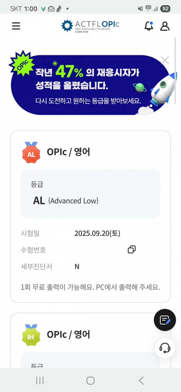 저는 대기업에 다니고 있습니다. 회사에서 지속적으로 오픽 성적을 요구하는데 나머지 등급은 주기적으로 갱신을 해야 하는데 AL의 경우는 퇴사할때까지 해당 최고등급을 인정해줘서 갱신을 할 필요가 없어서 AL을 목표로 하게 되었습니다. |