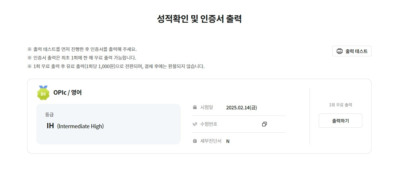 그러나 정소현 강사님을 통하여 현재 오픽의 트렌드, 고득점 달성을 위한 방법, 효과적인 공부 방법 등 많은 것들을 배울 수 있었으며 그 결과, 첫 오픽 시험에서 원하던 IH 등급을 받을 수 있었습니다. 두달 반 정도 걸렸네요. 저는 정말 강사님이 말씀하시는 길로만 따라가려 했고, 그게 좋은 결과를 낼 수 있었던 가장 큰 이유인 것 같습니다.